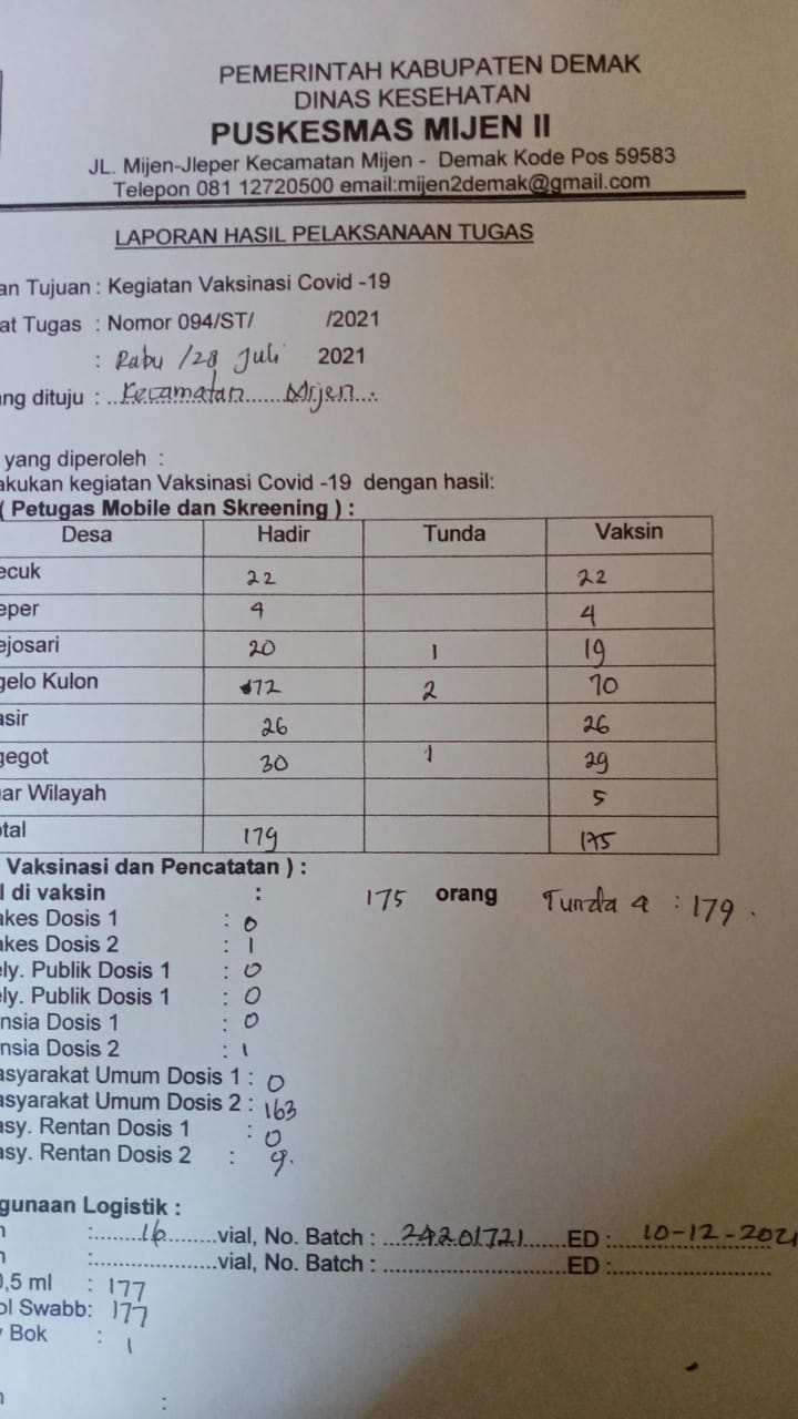 Hari Rabu tanggal 28 Juli 2021 bertempat di ruang aula Pertemuan Kecamatan Mijen Kabupaten Demak melaksanakan kegiatan Vaksinasi Covid-19 Dosis 2 oleh tim Puskesmas Mijen 2 Kecamatan Mijen Kabupaten Demak, kegiatan di hadiri oleh Forkopimcam, Kepala Puskesmas Mijen 2 beserta stafnya, Warga Masyarakat di wilayah Puskesmas Mijen 2, kegiatan ini di laksanakan selama 2 hari dari tanggal 27 -28 Juli 2021, adapun yang tervaksin dari jumlah 179 orang yang tervaksin sebanyak 175 orang, kegiatan ini tetap mematuhi protokol kesehatan dengan selalu memakai masker, mencuci tangan dan menjaga jarak, serta menjauhi kerumunan.