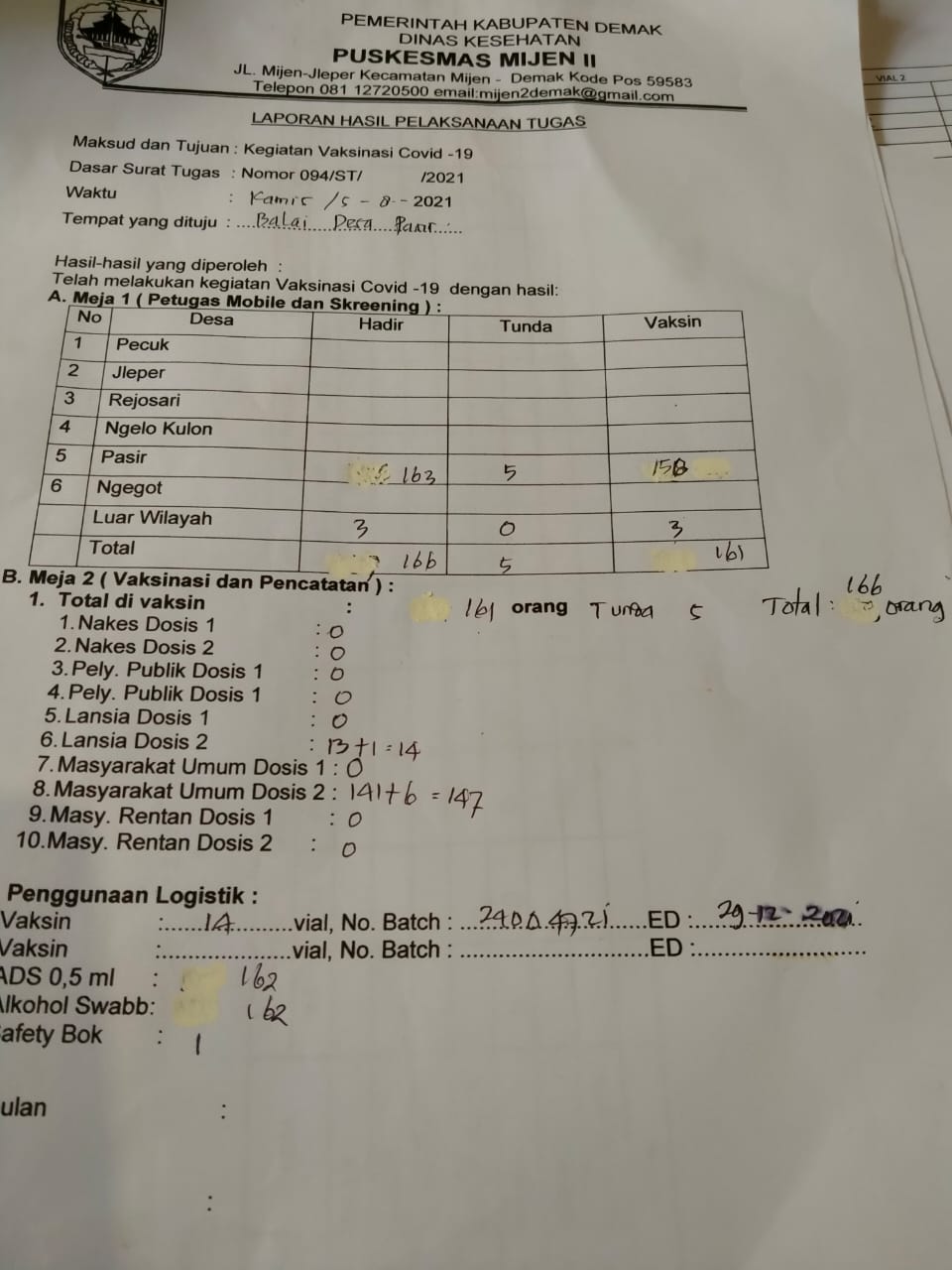 Hari Kamis tanggal 5 Agustus 2021 bertempat di balai Desa Pasir dan Balai Desa Ngegot melaksanakan kegiatan Vaksinasi Covid – 19 dosis 2, hadir dalam kegiatan tersebut Camat Mijen yang di wakili oleh Kasi Kesra Kecamatan Mijen, Polsek, koramil Mijen, Kepala Puskesmas Mijen 2 beserta Stafnya, Warga Masyarakat Desa Pasir dan Desa Ngegot yang akan di vaksin, adapun yang tervaksin covid- 19 hari ini Desa Pasir sebagai berikut Hadir : 163 orang , dengan rincian 3 orang luar daerah, 5 orang tunda jumlah total : 161 orang dan untuk Desa Ngegot sebagai berikut : hadir 131 orang, tunda 5 orang jumlah yang tervaksin : 126 orang , kegiatan ini tetap mematuhi protokol kesehatan dengan selalu memakai masker, mencuci tangan dan menjaga jarak, menjauhi kerumunan, mengurangi mobilitas.