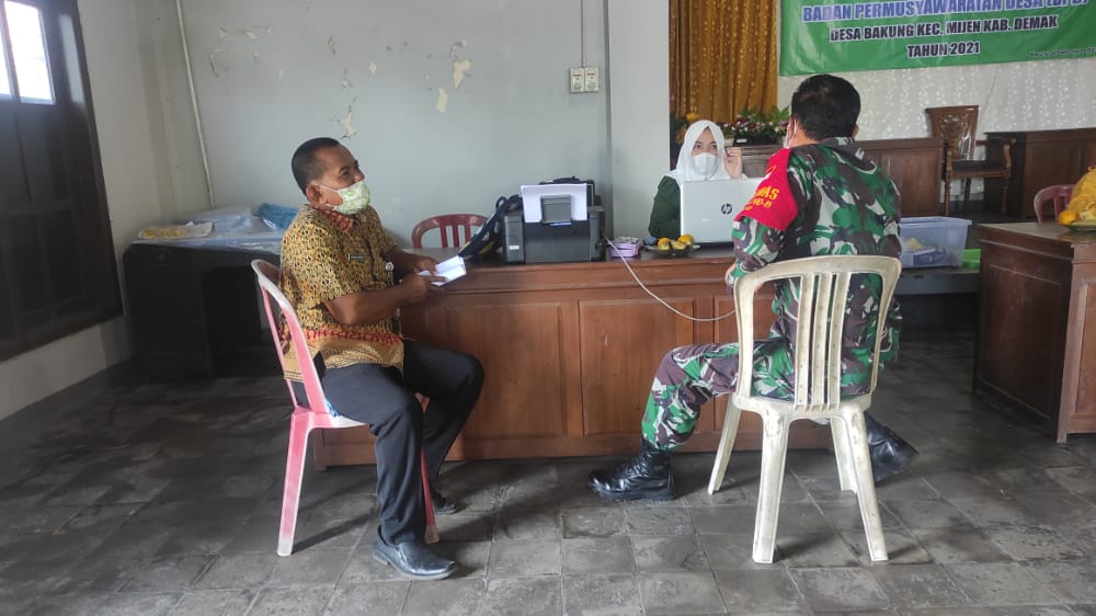 Hari Selasa tanggal 12 Oktober 2021 di Balai Desa Bakung Kecamatan Mijen kabupaten Demak melaksanakan kegiatan Vaksinasi Covid -19 Dosis 2, hadir dalam kegiatan tersebut Kasi Kesra Kecamatan Mijen beserta Stafnya, Kepala Puskesmas Mijen 1 beserta stafnya, Babinsa, Babinkamtibmas Desa Bakung, Kepala Desa beserta perangkatnya, serta warga masyarakat peserta Vaksin, kegiatan vaksinasi ini yaitu Dosis ke 2, bagi warga masyarakat Desa Bakung yang sudah vaksin pertama bisa Vaksin ke Kedua dengan membawa foto Copy KTP dan Bukti Vaksin pertama , kegiatan vaksinasi ini bertujuan untuk menambah daya tahan, imun supaya kebal terhadap virus, serta program pemerintah untuk mengatasi Covid – 19, kegiatan ini tetap mematuhi protokol kesehatan dengan selalu memakai masker, mencuci tangan dan menjaga jarak.