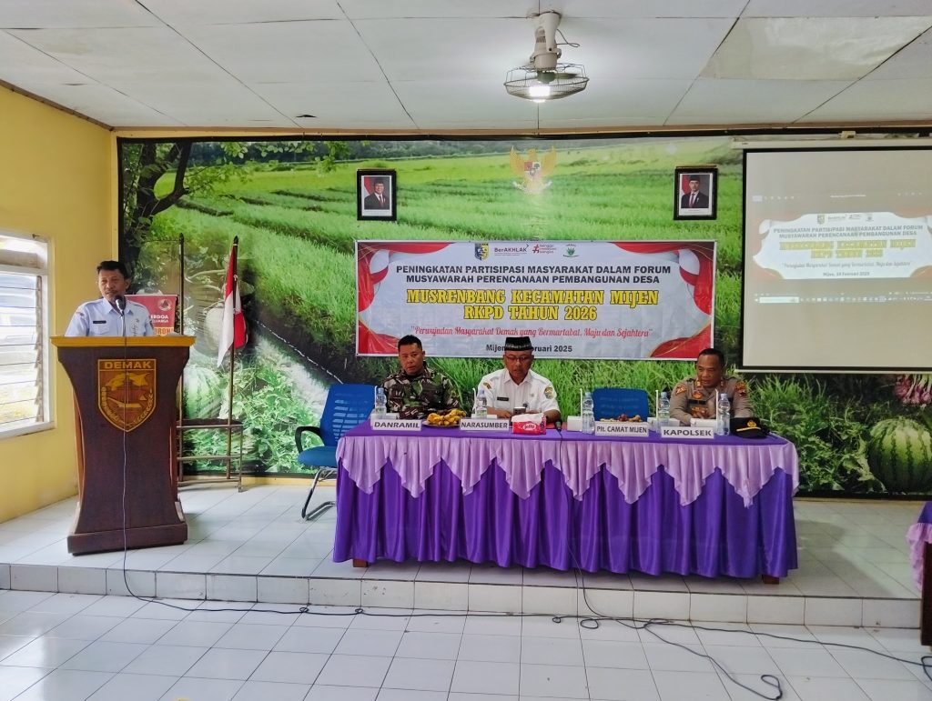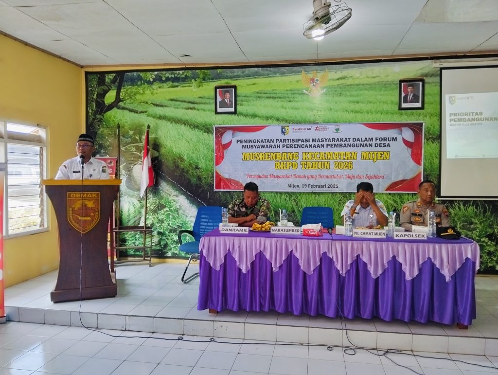 Hari Rabu Tanggal 19 Februari 2025 bertempat di Aula Pertemuan Kecamatan Mijen melaksanakan kegiatan ” Musrenbangcam RKPD tahun 2026. dengan tema ” Perwujudan Masyarakat Demak yang bermartabat , Maju dan Sejahtera.hadir dalam kegiatan tersebut Sekretaris BAPPERIDA Kabupaten Demak Bapak ALI AKHMAD, S.Kes.M.Kes.beserta TIM, Anggota DPRD Kabupaten Demak Bapak SULKHAN ( Fraksi NASDEM ), Bapak H. SUKONO ( Fraksi PKB ), Bapak KRISNA BAYU ILHAM SUMARNO,SH (Fraksi PDIP ), Bapak NURYONO PRASETYO,SE ( Fraksi Golkar ), PLt. Camat Mijen Bapak PURKANTO,SH.MM, KAPOLSEK MIJEN, DANRAMIL MIJEN, Kepala Dinas Instansi Se Kecamatan Mijen, Kepala Desa, Sekretaris Desa, BPD Se kecamatan Mijen, Tomas dan ketua Organisasi se Kecamatan Mijen.